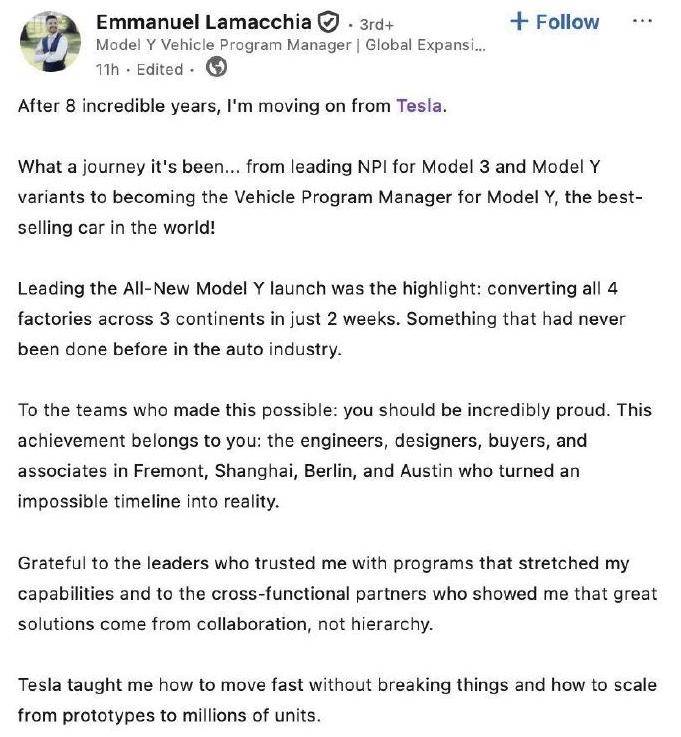 11月11日,據(jù)外媒報道,特斯拉兩款主力車型的項目負責人——Model Y整車項目經(jīng)理埃馬紐埃爾·拉馬基亞(Emmanuel Lamacchia)與Cybertruck項目負責人西達恩特·阿瓦斯蒂(Siddhant Awasthi)——于本周日相繼在社交平臺宣布離職。至此,Model 3、Model Y、Cybertruck 作為特斯拉最重要的三條產(chǎn)品線,其負責人已全部離開。
