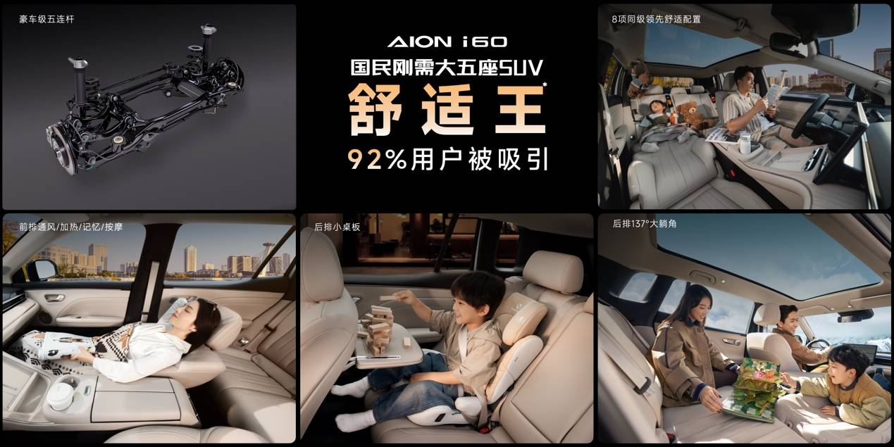 從產品配置來看,埃安i60的大空間、舒適駕乘、安全保障、續航表現和智能體驗得到了用戶的廣泛認可。同級最大的后排,成年人可以輕易找到舒服的坐姿,小孩子也能站直玩耍。同級最大137度放倒的后排座椅,老人久坐也不覺疲憊,前排“滿血”座椅支持通風、加熱、按摩,長時間駕駛也能一身輕松。