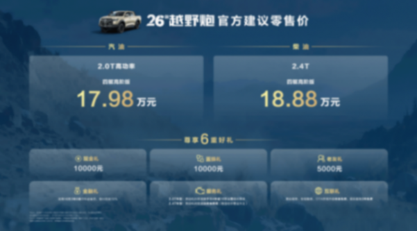 越野炮豪華 6 禮:至高 10000 元現金禮 + 10000 元置換禮,搭配 5000 元老友禮及金融、服務、互聯三重保障,越野出行無后顧之憂。
