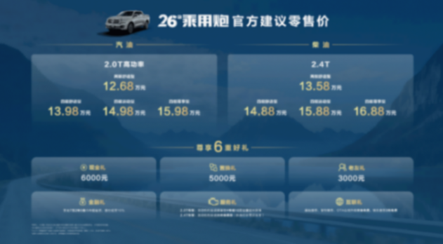 以乘用車標準打造的 2026 款乘用炮,搭載 2.4T+9AT 黃金動力組合,汽油版升級高功率輸出,輕松適配城市通勤與戶外出行。座艙配置全面升級,搭載 Coffee OS 3 智能座艙,10.25 英寸全液晶儀表 + 14.6 英寸防眩目中控大屏,16G 內存 + 128G 存儲實現 3 秒瞬時開機,久用不卡頓。