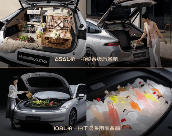 但在空間方面,啟源A06憑借更大的車身尺寸占據優勢。其長寬高為4885/1916/1496 mm,軸距達2922mm,定位中大型轎車。前備廂容積108L,后備廂656L,儲物能力極為出色。更值得一提的是,它的后排座椅還支持電動一鍵放倒,與后備廂連通后可形成近2米的“大床”,能輕松容納兩名180cm成年人平躺,露營、午休、長途出行皆宜。