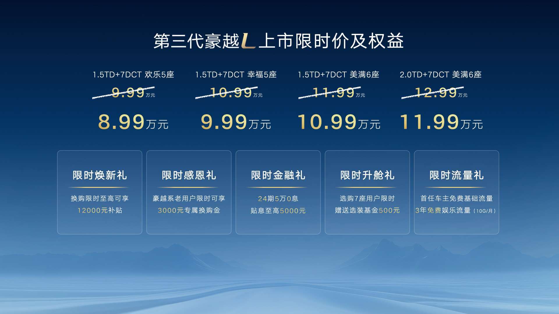 11月27日,吉利新款豪越L上市,推出4款車型,售價(jià)分別為8.99萬(wàn)、9.99萬(wàn)、10.99萬(wàn)和11.99萬(wàn)元。